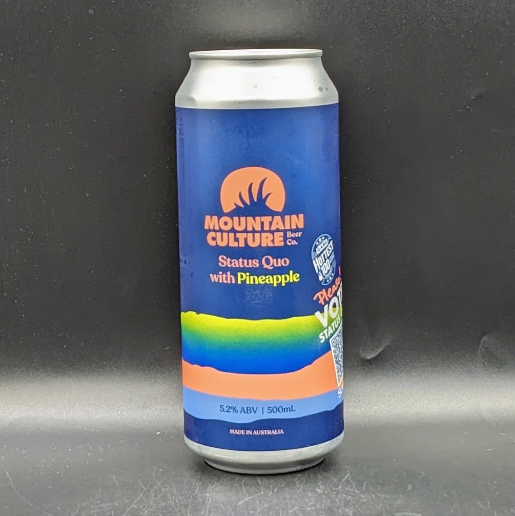 "This beer is Mountain Culture in a can"—but this time, with a massive tropical twist. Mountain Culture has taken their number one, fan-favourite Status Quo Hazy Pale and amplified its natural tropical character by adding fresh pineapple. It’s still the juicy, hazy, full-flavoured New England Pale you love, packed with massive late and dry hop additions, but now it’s more tropical than a Hawaiian ukulele orchestra. Brewed fresh in the Blue Mountains, this limited release is sunshine in a 500ml tin.